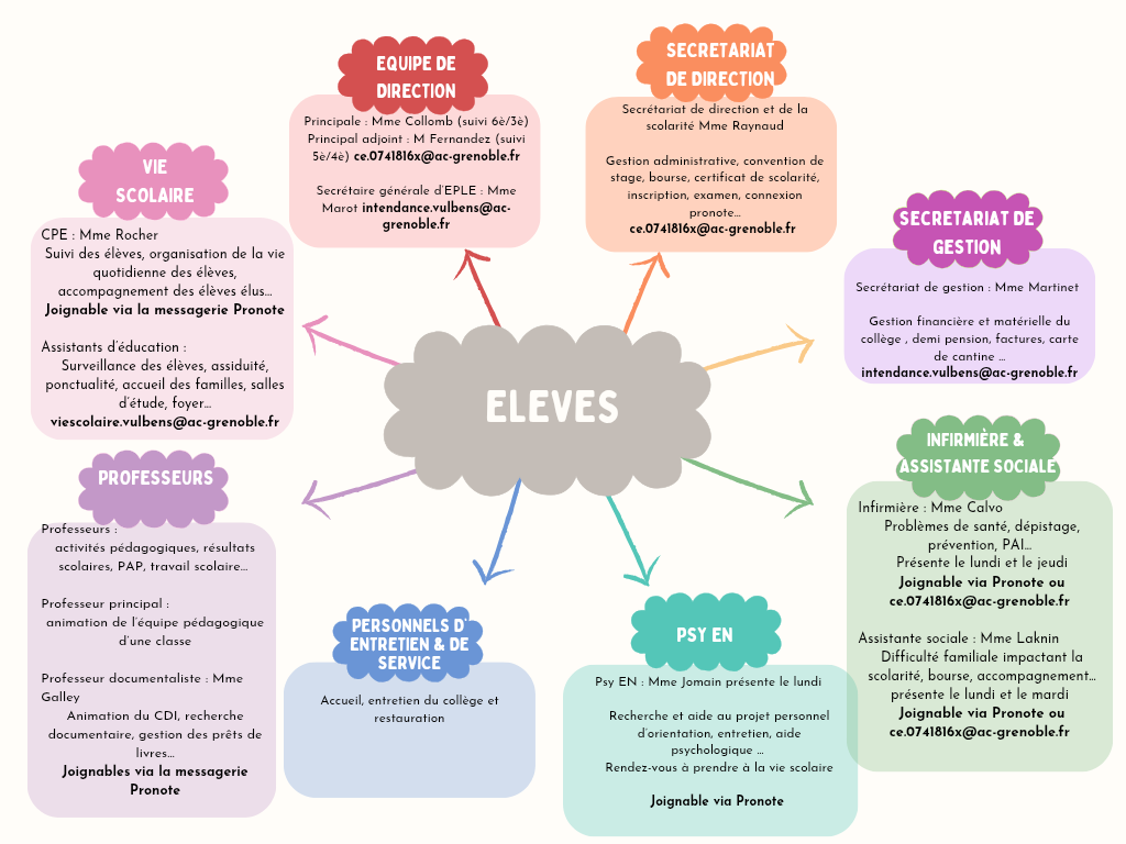 Cet organigramme montre qui fait quoi dans le collège et comment contacter chaque service ou personnel. Il vous aide à identifier rapidement le bon interlocuteur selon votre besoin.