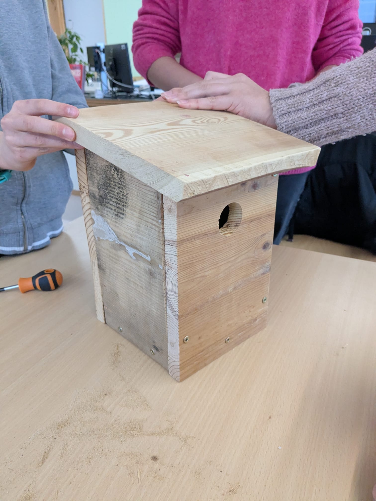 Après une explication sur la famille des oiseaux, leurs cycle durant une journée selon la saison, les élèves ont assemblé des nichoirs.
